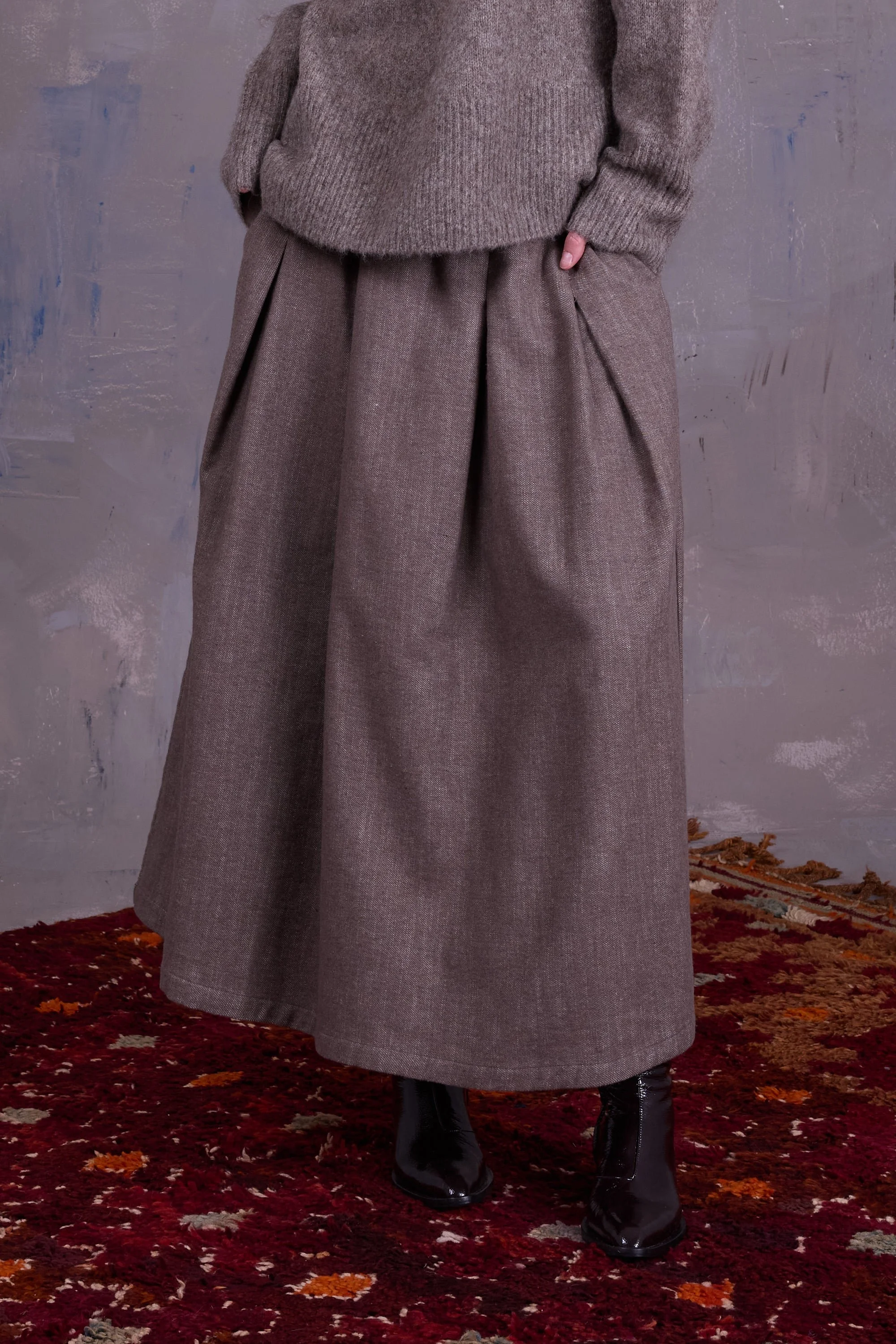 Losvallende rok met plooien , zakken en elastiek in de taille